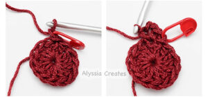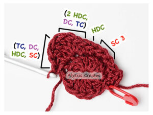 - Into remaining sts, work: (sc, hdc, dc, tc), (tc, dc, 2 hdc), hdc, sc 2. Sl st to join ch 1 at beg of round. (27 sts around – not including the ch 2 at bottom of heart)