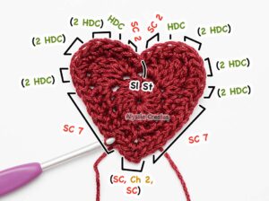 - Into remaining sts, work: sc 2, hdc, [(2 hdc) into next st] 3 times, sc 5. Sl st to join the ch 1 at beg of round. FO. (35 sts around – not including the ch 2 at bottom of heart)